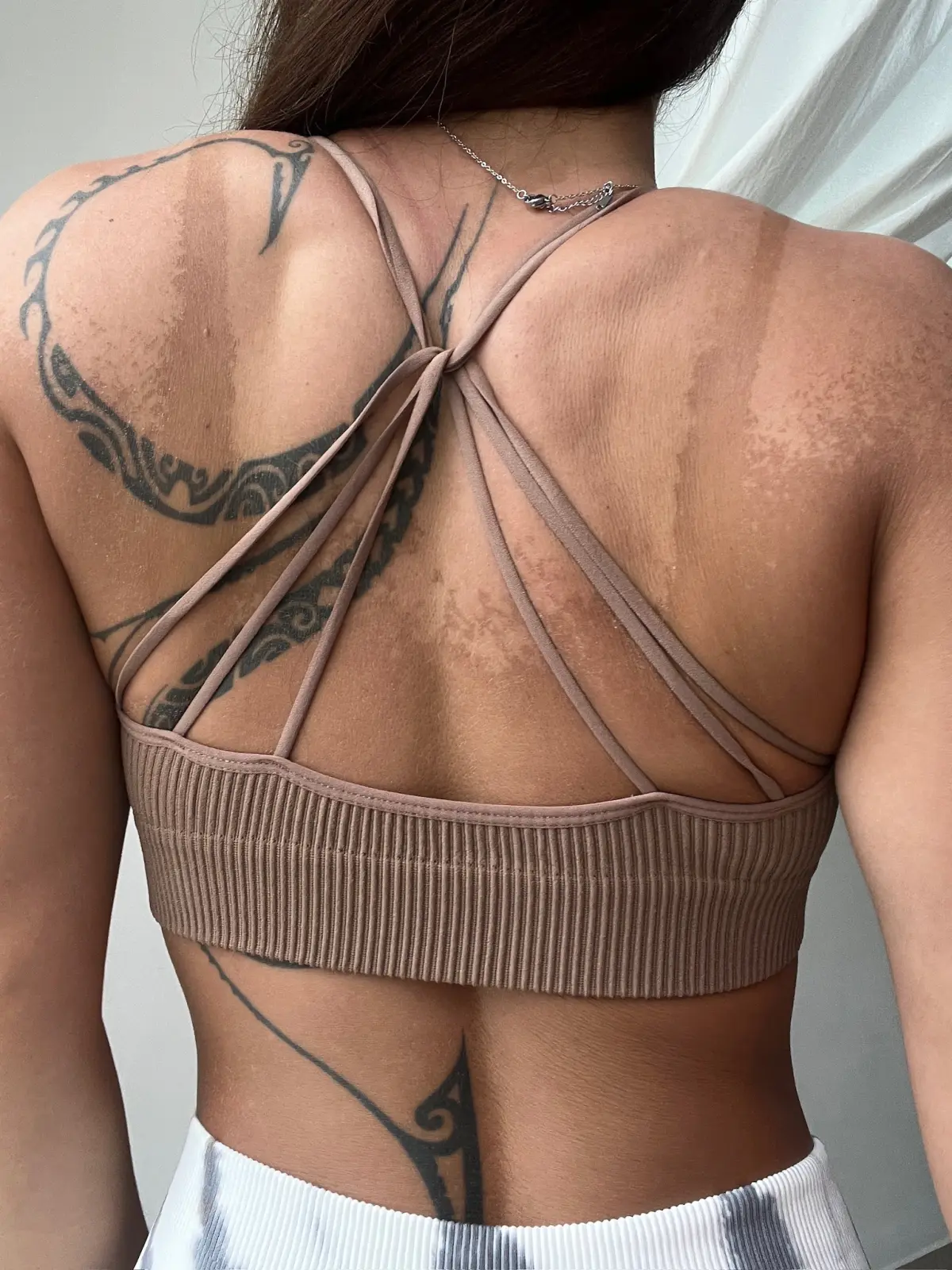 Un top que combina comodidad, soporte y un estilo natural. Confeccionado en tela elástica y respirable, se adapta como una segunda piel, ofreciendo libertad total de movimiento y un ajuste firme que realza tu figura. El tono tierra le aporta calidez, versatilidad y un aire sofisticado, ideal para entrenar con onda o completar un look urbano chic.