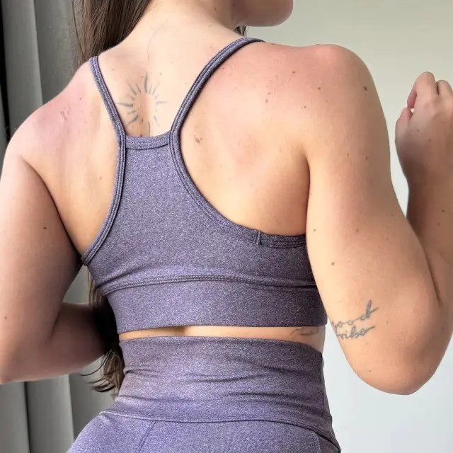 Un top que reúne comodidad, soporte y estilo en cada detalle. Confeccionado en tela elástica y respirable, se adapta perfectamente a tu cuerpo, brindando libertad de movimiento y un ajuste firme que realza tu figura. Su tono morado le da un aire vibrante y sofisticado, ideal para entrenar con energía o armar un look urbano con personalidad.